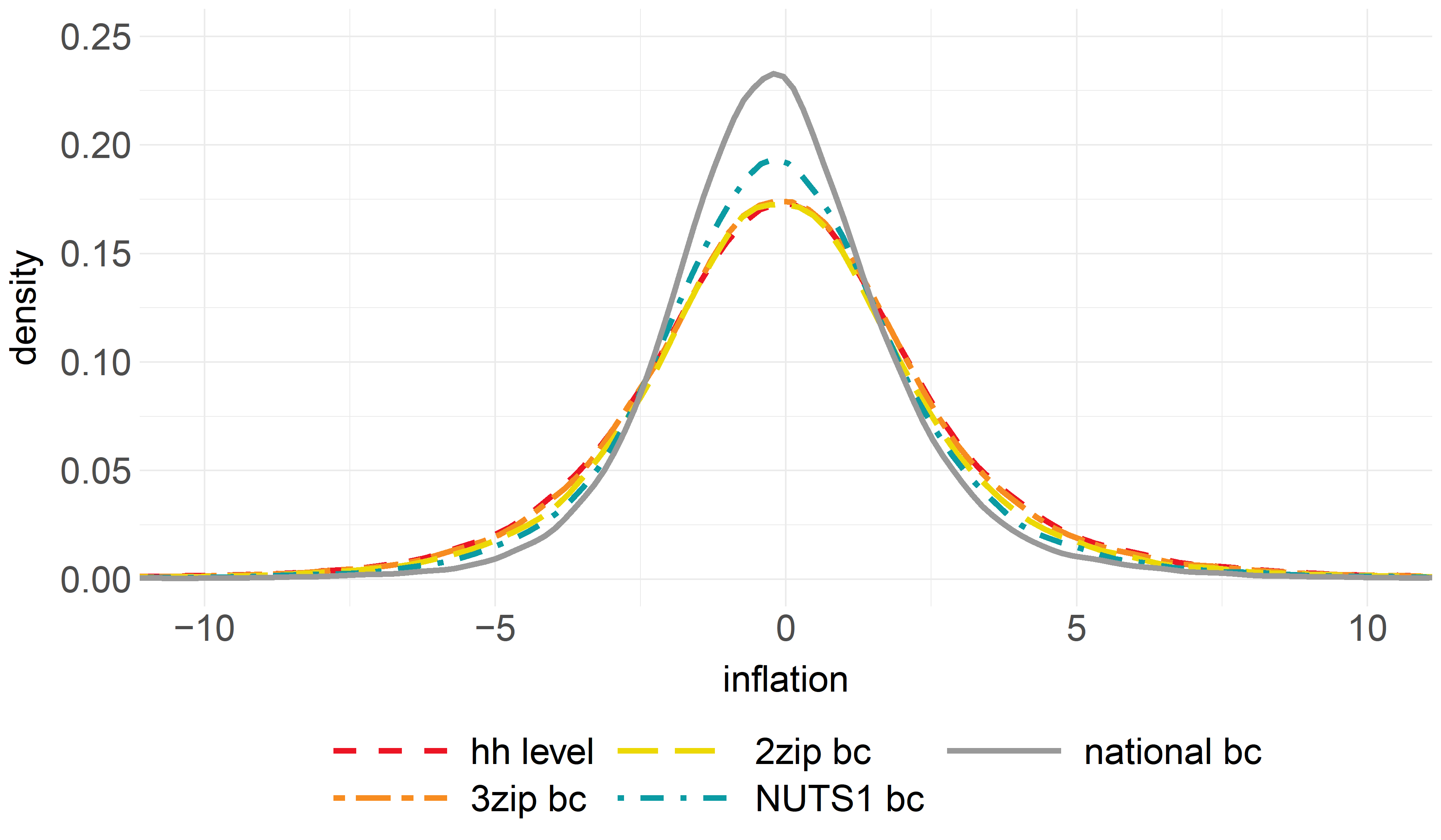 Distribution of household-level inflation rates based on household-level prices and regional prices