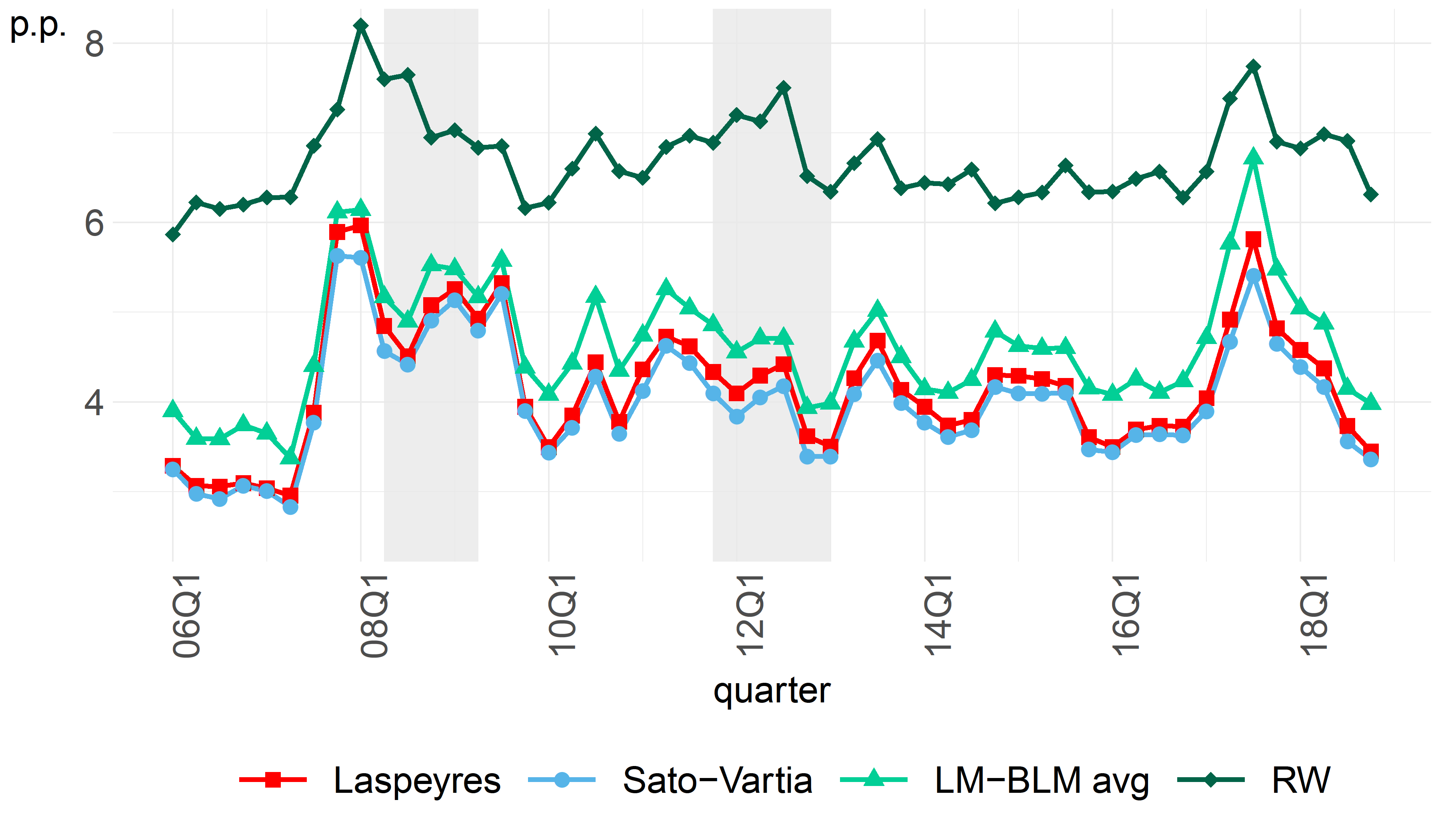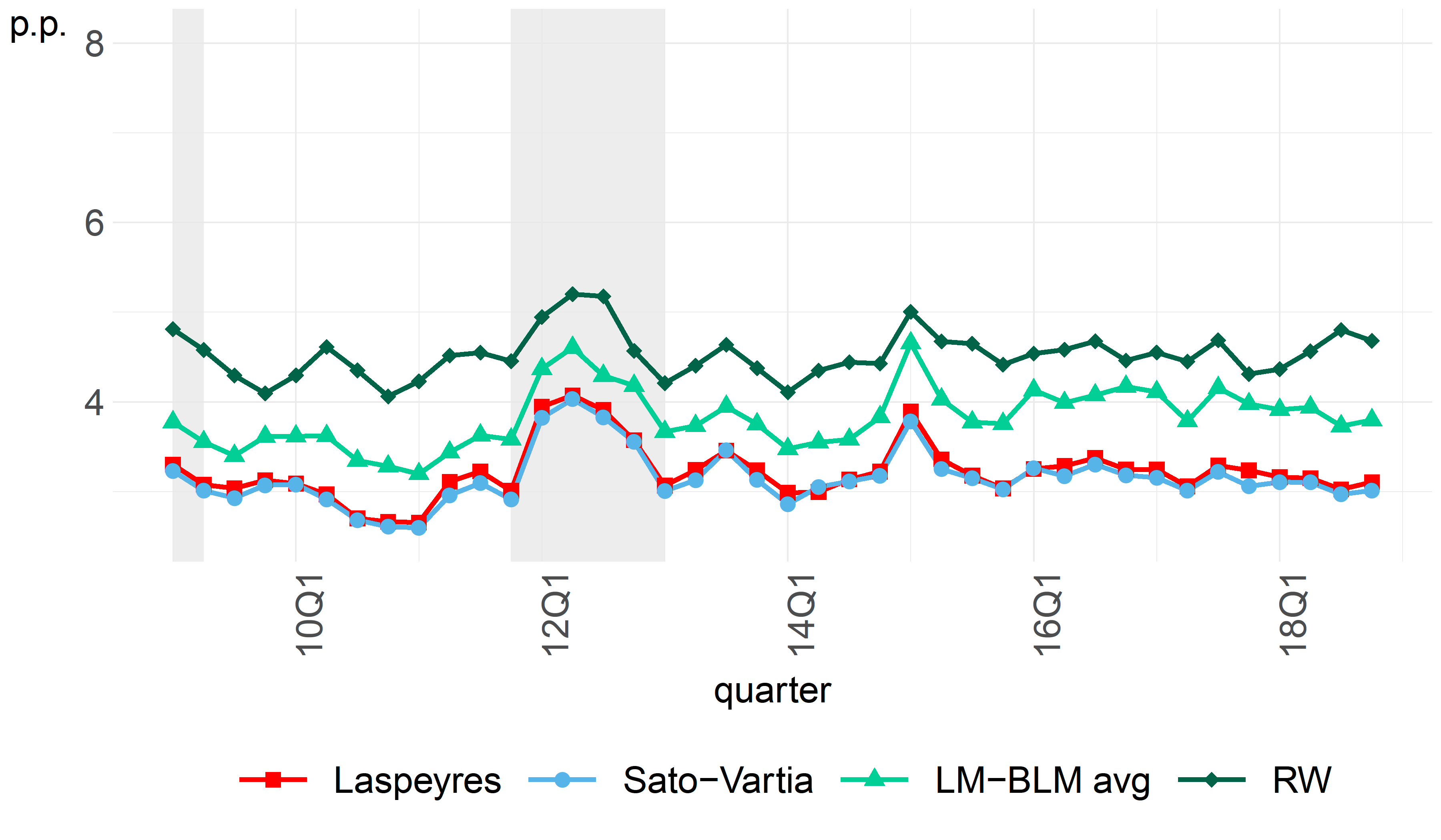Notes: The chart shows the interquartile range of quarterly year-on-year household-level inflation indices, i.e., the difference between households in the 25th and the 75th percentile. “Sato-Vartia” denotes the index of Sato (1976) and Vartia (1976), “LM-BLM avg” denotes the geometric average of the Lloyd-Moulton and the Backwards Lloyd-Moulton indices of Martin (2022), and “RW” denotes the Redding-Weinstein (2020) index. The data cover food and beverages only and are restricted to households that repurchase at least 25 products.