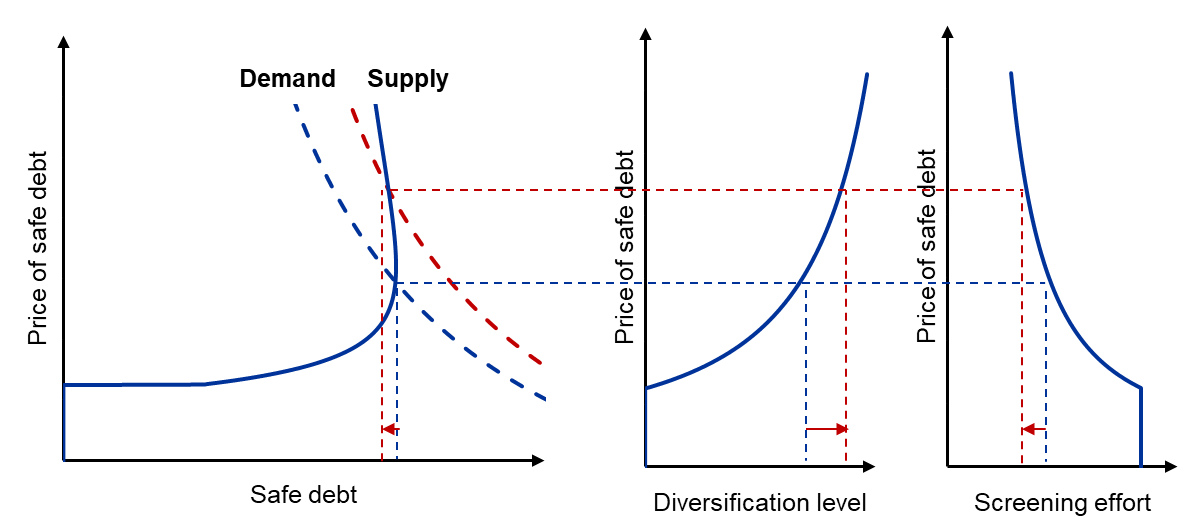 Lower loan quality not only undermines financial stability but also affects the amount of safe debt banks can issue. The safe payoffs from the diversified loan portfolio depend on the overall quality of loans in the economy. When the diversified portfolio consists of higher quality loans, its safe payoffs increase, allowing banks to issue more debt backed by this portfolio. The opposite holds as well: lower quality loans reduce safe payoffs, limiting debt issuance. So loan quality – driven by banks’ screening efforts – and the level of diversification jointly determine the aggregate level of safe assets supplied by banks.