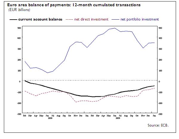 In January 2010 the working day and seasonally adjusted current account of the euro area recorded a deficit of EUR 8.1 billion. In the financial account, combined direct and portfolio investment recorded net outflows of EUR 11 billion (non-seasonally adjusted).