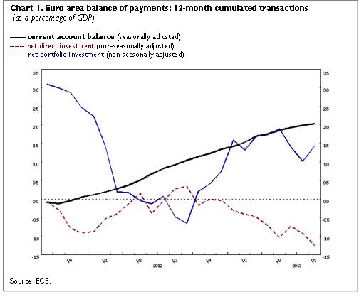 In August 2013 the seasonally adjusted current account of the euro area recorded a surplus of €17.4 billion. In the financial account, combined direct and portfolio investment recorded net inflows of €12 billion (non-seasonally adjusted).