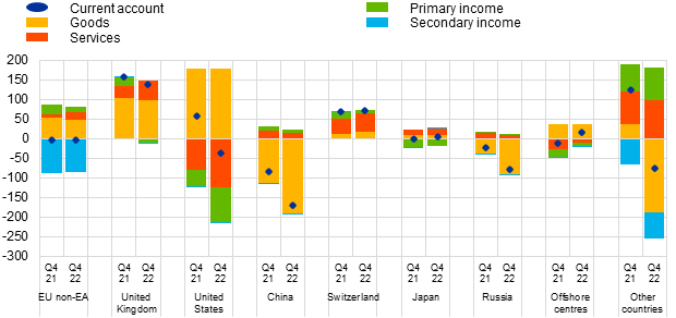 Data on the geographical counterparts of the euro area current account (Chart 1) show that in 2022 the euro area recorded its largest bilateral deficits vis-à-vis China (€170 billion, up from €83 billion in 2021), Russia (€79 billion, up from €22 billion) and the residual group of other countries (€76 billion, after a surplus of €124 billion). The largest bilateral surpluses were recorded vis-à-vis the United Kingdom (€137 billion, down from €158 billion) and Switzerland (€72 billion, up from €68 billion). Furthermore, in 2022 the euro area recorded an annual bilateral current account deficit of €37 billion vis-à-vis the United States, following a surplus of €57 billion in 2021.