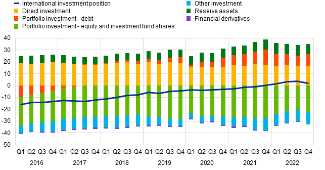 At the end of the fourth quarter of 2022, the international investment position of the euro area recorded net assets of €265 billion vis-à-vis the rest of the world (2.0% of euro area GDP), down from €475 billion in the previous quarter (Chart 2 and Table 2).
