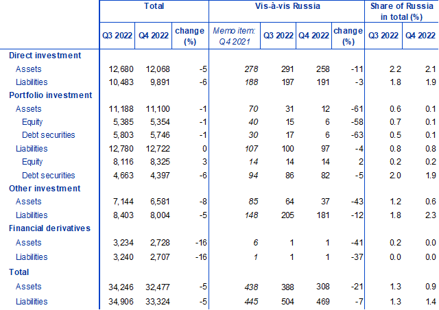 • Euro area financial assets vis-à-vis Russia amounted to €308 billion (0.9% of euro area external assets) at end of the fourth quarter of 2022, down by 21% since end of previous quarter