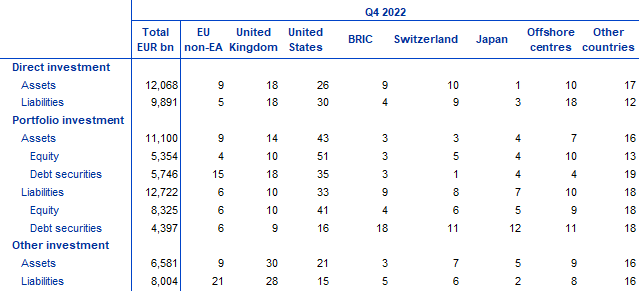 At the end of 2022 euro area direct investment assets were €12.1 trillion, 26% of which was invested in the United States and 18% in the United Kingdom (see Table 4). Euro area direct investment liabilities were €9.9 trillion, with 30% being investments from the United States, 18% from the United Kingdom and 18% from offshore centres.