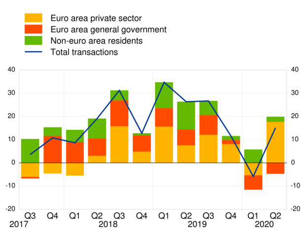 Looking at holdings by issuing sector, the annual growth rate of debt securities issued by euro area general government was 0.0% in the second quarter of 2020, with net sales in the quarter amounting to €5 billion. As regards debt securities issued by the private sector, the annual growth rate was 2.9%, and quarterly net purchases amounted to €18 billion. For debt securities issued by non-euro area residents, the annual growth rate was 2.3%, with quarterly net purchases of €2 billion.