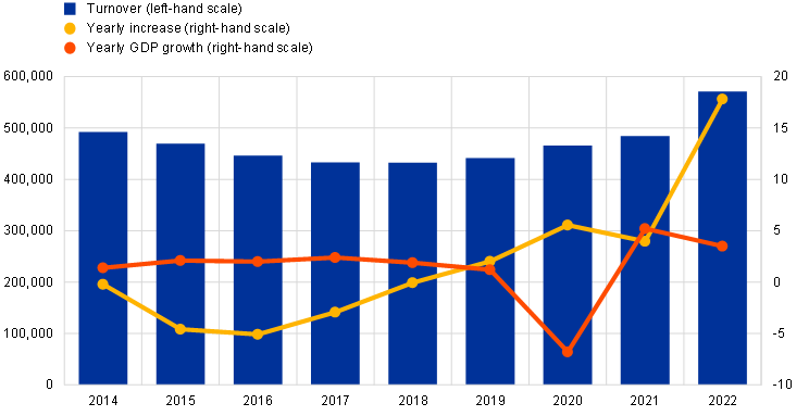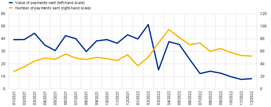 Besides monitoring the number of payments settled in TARGET2, the Eurosystem also regularly looked at the evolution of TARGET2 turnover over time. This analysis intensified last year in the light of technical changes and monetary policy decisions that affected the value of payments exchanged in TARGET2. This box presents the insights gained from analysis of the 2022 turnover.