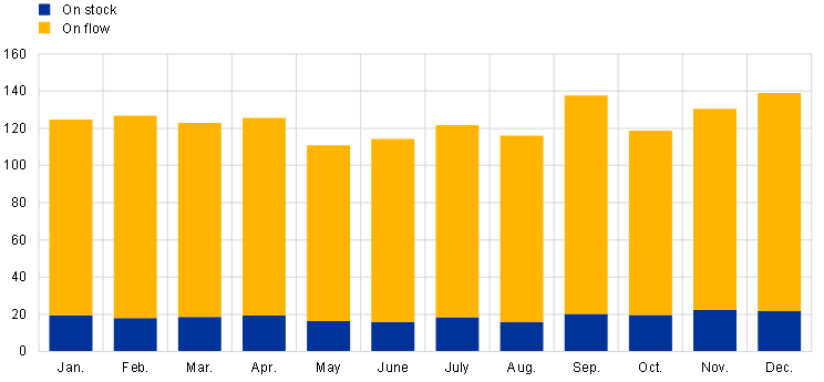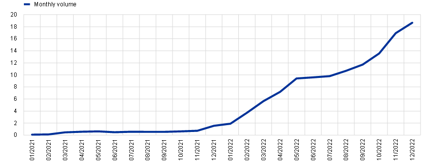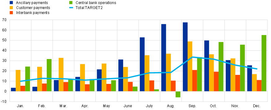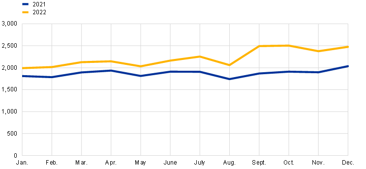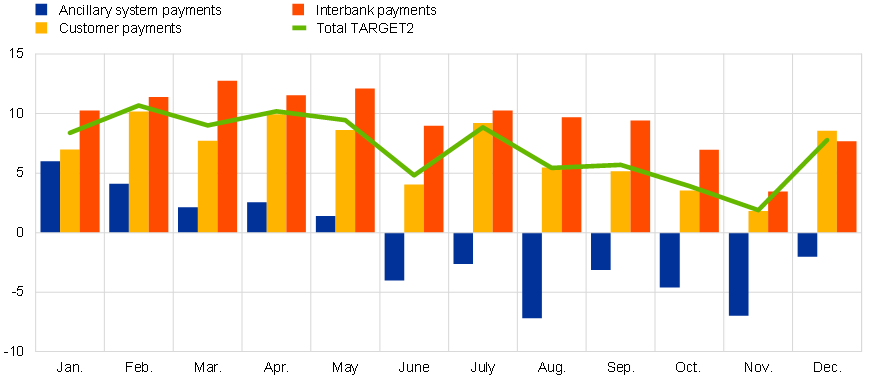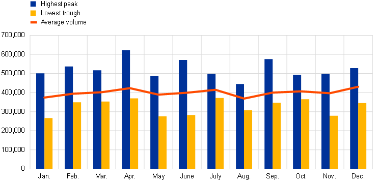 Throughout the whole year average daily volumes in TARGET2 calculated on a monthly basis were above the levels recorded for the corresponding months in 2021 (Chart 6). The biggest year-on-year difference, amounting to 11%, was observed in February and this trend continued for the rest of the year. Overall, Chart 6 indicates a seasonal pattern similar to that of the previous year.