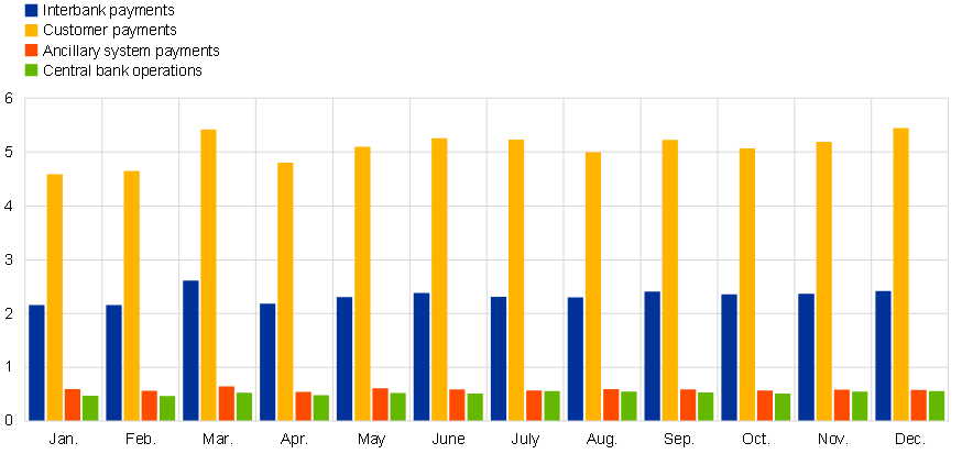 Overall, the positive trend observed in 2021 continued in 2022, though at a more moderate pace. Between 4.6 million and 5.4 million customer payments were settled each month (see Chart B). Customer payments behaved in line with the seasonal patterns typical of the pre-pandemic period: decreasing in January and February, around April and in August, while increasing towards the end of the year. The peak was reached in December. Interbank payments ranged from 2.2 million to 2.6 million transactions per month and followed a trend analogous to customer payments. Ancillary system payments and central bank operations, by contrast, were less impacted by seasonal effects.