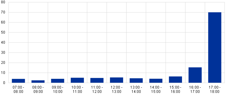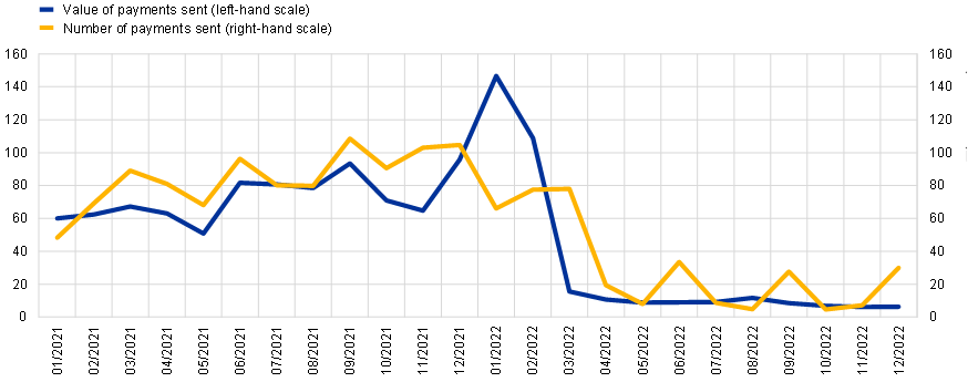 Peaks and troughs in the system’s values can also be influenced by other factors, such as TARGET2 holidays or the end of reserve maintenance periods. For example, the lowest values are typically recorded during the summer holidays and on days that are national holidays in some Member States or in other significant economies outside the EU. In 2022, for instance, the lowest values processed coincided with a public holiday in the United States (Presidents’ Day on 21 February).