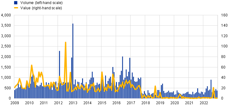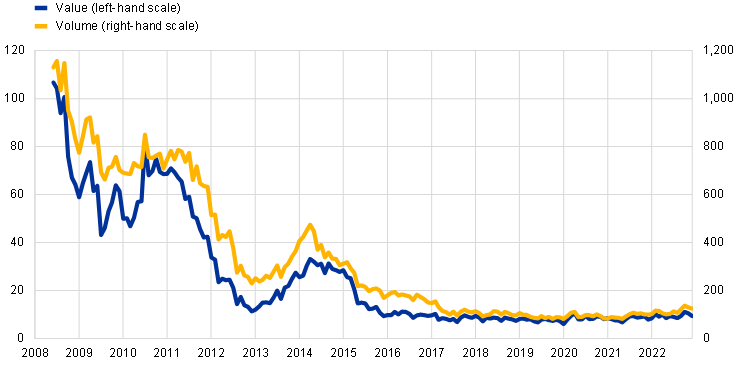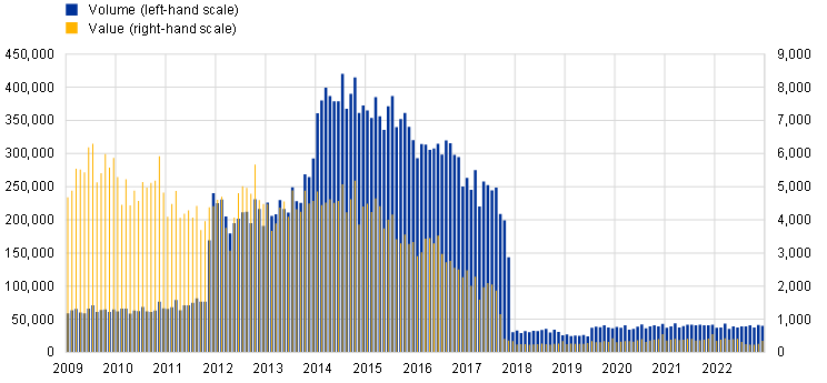 The Eurosystem carefully monitored TARGET2 volumes over time, not least because of their relevance for revenues and cost recovery. In 2022 the focus was on the evolution of traffic after the strong growth observed following the pandemic. This box presents the insights gained from analysis of the 2022 volumes.
