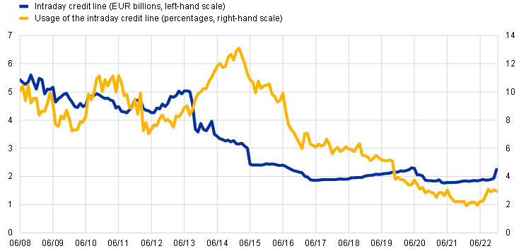 Chart 2 depicts the average daily turnover generated in TARGET2 for each month in 2021 and 2022, thus showing the seasonal pattern of the system. While the general pattern for both years is very similar, the values recorded in 2022 are higher than they were in the same periods of 2021, especially from the third quarter onwards, as ECB policy rates increased. More details can be found in Box 5.