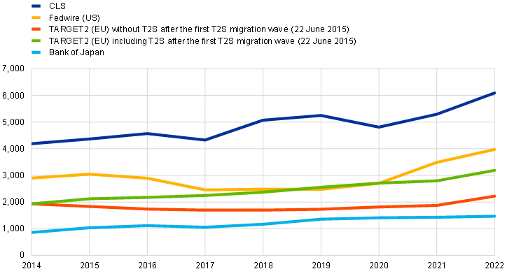 Sources: TARGET2, Fedwire Funds Service (website of the Federal Reserve System); SWIFT FIN Traffic (SWIFT website); BOJ Time-Series Data (Bank of Japan website); Key payment statistics (Bank of England website); Annual Statistics From 1970 to 2022 (the Clearing House website); SIC statistics (SIX website); and ECB data.