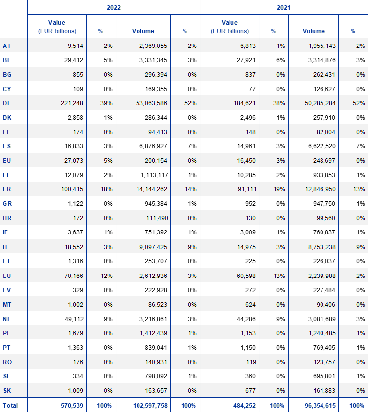 In 2022 TARGET2 maintained its leading position in Europe, processing 92% of the total value settled by large-value payment systems in euro. It also remained one of the largest payment systems worldwide. Compared with the previous year, the total turnover processed increased by 17.8%, reaching €570.5 trillion.[7] The total volume of payments grew by 6.5% to 102.6 million transactions.