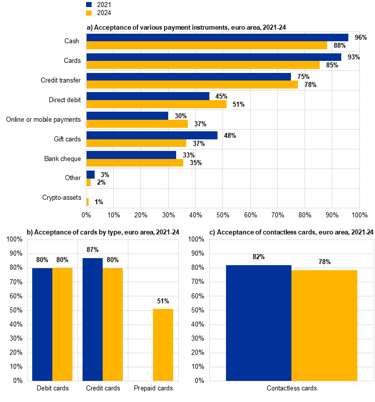 Notes: The 2024 survey considers crypto-assets as a separate item, while in 2021 they were included as part of “Other”. The 2024 survey also included prepaid cards when asking about cards’ acceptance, but these were not mentioned in 2021.