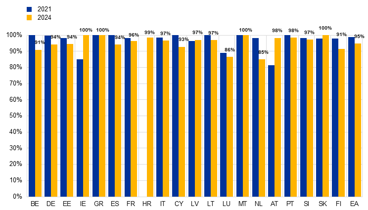 When we analyse cash acceptance in the retail trade sector (Chart 4), we can see that the acceptance rate has declined in most countries since 2021, with a decrease of more than 10 percentage points in nine countries. However, cash acceptance in this sector has increased in Italy (+1 percentage point) and Malta (+5 percentage points). The generalised decrease accounts for the 7 percentage point fall in cash acceptance at euro area level, from 96% in 2021 to 89% in 2024.