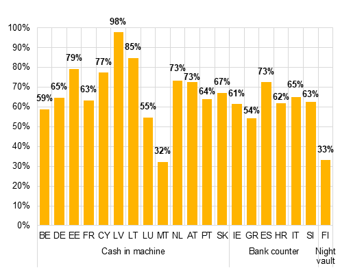 Notes: In most countries the most frequently cited reason for companies not accepting cash (ignoring “other” as it is not specific) is that cash is not used enough by their customers (Chart 7b). In Belgium, the Netherlands and Finland the main reason is the inconvenience of depositing or withdrawing cash, while in Lithuania it is the security risk (e.g. hacking or robbery) and in Latvia it is that the use of cash is time-consuming.