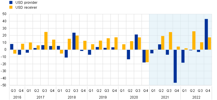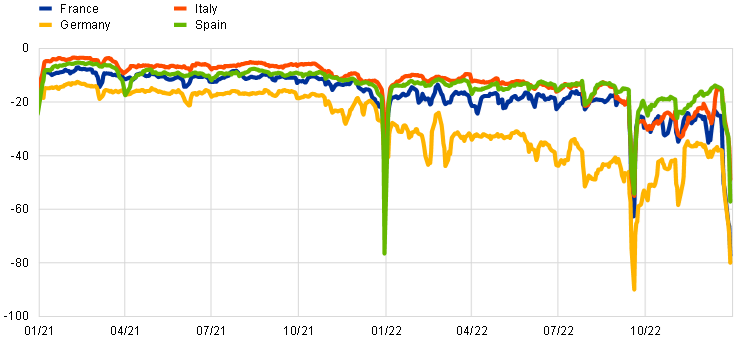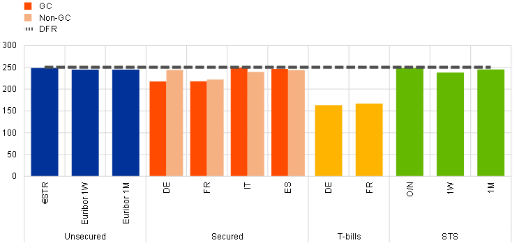 The scarcity of certain government securities exerted downward pressure on secured rates. During the severe phase of the COVID-19 pandemic in 2020, repo rates remained well anchored to the DFR and rather homogeneous across jurisdictions. However, repo rates gradually drifted below the DFR and became more dispersed across Member States in the period under review. As most secured trades were backed by sovereign debt, scarcity of government bonds – particularly severe for certain German issuances – caused a larger share of bonds to trade at very low repo rates and a greater segmentation of repo rates across jurisdictions. The scarcity worsened in autumn 2022 owing to a higher preference for less risky short-term investments and higher margin requirements. This resulted in more demand for collateral as its value declined, thus underpinning further downward pressures on repo rates. Repo price developments reverberate in the financial conditions in government and corporate debt markets via asset swaps.