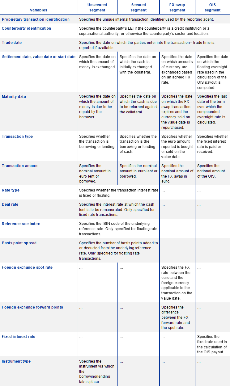 Note: The above table is a selective and abbreviated overview of the variables reported to the ECB in the context of MMSR. For a comprehensive overview, please refer to the MMSR reporting instructions, available on the ECB’s website.