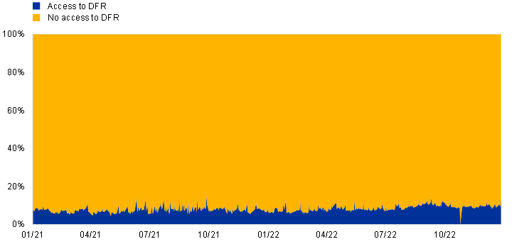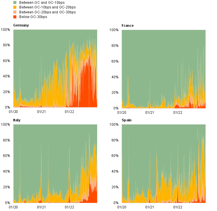 During 2021 and 2022 secured rates gradually drifted below the DFR and became more dispersed than in 2020. Scarcity of government bonds, particularly severe for certain issuances, caused downward pressure on rates and resulted in a larger share of trades well below the DFR. The structural scarcity of some government bonds was aggravated in autumn 2022 by a higher demand for short-term safe assets and an increase in short positions in the bond cash market, underpinning further stress in repo rates.