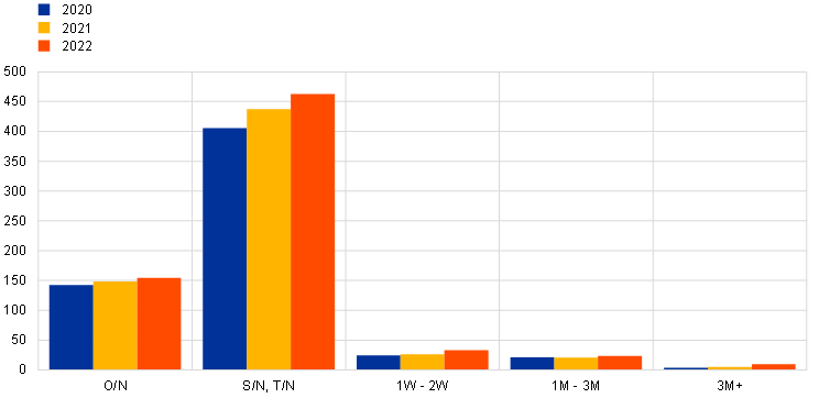 Spot trading volumes remained concentrated in maturities up to three months, while transactions with forward settlement tended to align exposures with the ECB’s maintenance period calendar (Chart 5.3.1). Looking at spot settlement transactions, the largest volumes can be found in the below three-month maturity bucket. By comparison, IRS referencing EURIBOR or LIBOR often have much longer maturities. On the other hand, OIS contracts with forward settlement saw their activity increase in 2022, particularly on those contracts coinciding with the dates of the ECB’s maintenance periods (denoted as MP-dated forward contracts).