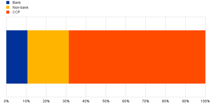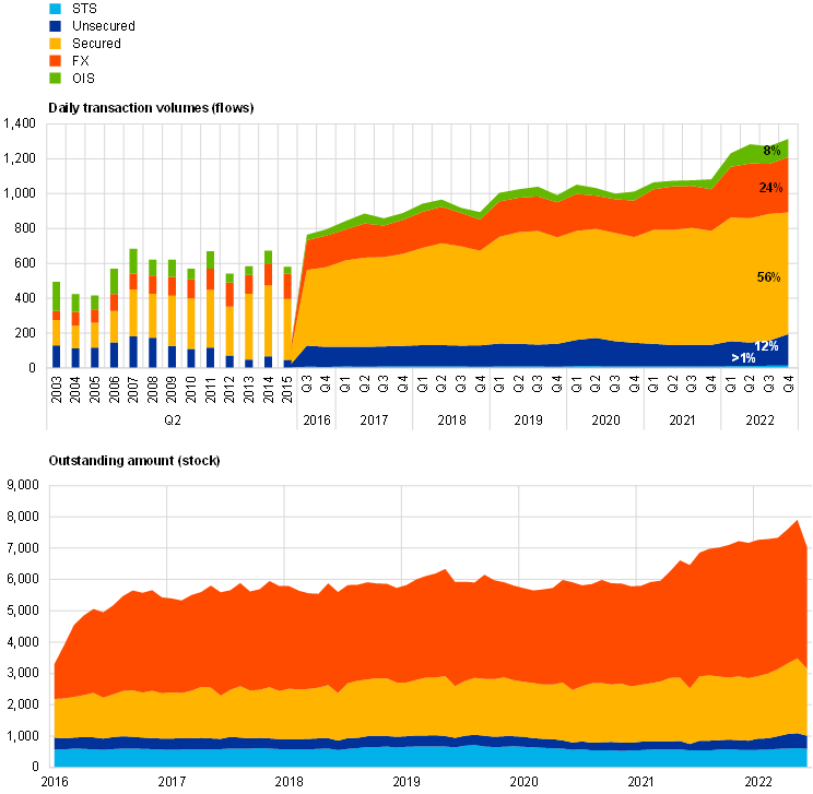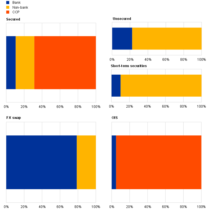 Sources: MMSR for secured, unsecured, FX swap, CSDB and ECB (Securities holdings statistics database – SHS) for STS. Some of the CCPs also have a banking licence. However, CCPs are displayed as a third category in this chart, separate from banks and non-banks.