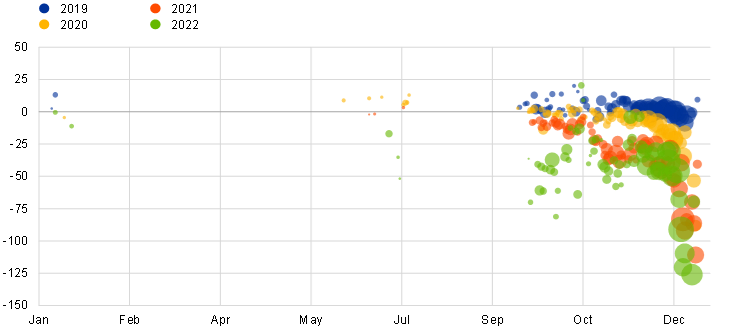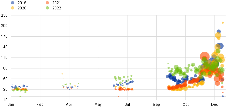 The pass-through to repo rates of the four ECB policy rate hikes in 2022 was not as orderly as for unsecured rates. The response of repo rates to each of the four policy rate hikes was heterogeneous, with rates collateralised by bonds with a structurally higher demand experiencing a more volatile pass-through. In September 2022, policy rates returned to positive territory and uncertainty surrounded the remuneration applicable to certain non-monetary policy deposits. This led to the expectation of large amounts of funds looking to be placed in the market, which resulted in a large drop in repo rates on the first days of the new maintenance period. The Eurosystem suspended the zero interest rate ceiling on certain non-monetary policy deposits until April 2023 and increased the limits of the securities lending facilities against cash from €150 billion to €250 billion. Moreover, the Deutsche Finanzagentur released €54 billion in German bonds to be used in the most expensive repo trades in order to alleviate collateral scarcity. These measures helped to stabilise rates closer to the DFR on the repo market and lay the foundations for a smooth end-of-year 2022 transition.