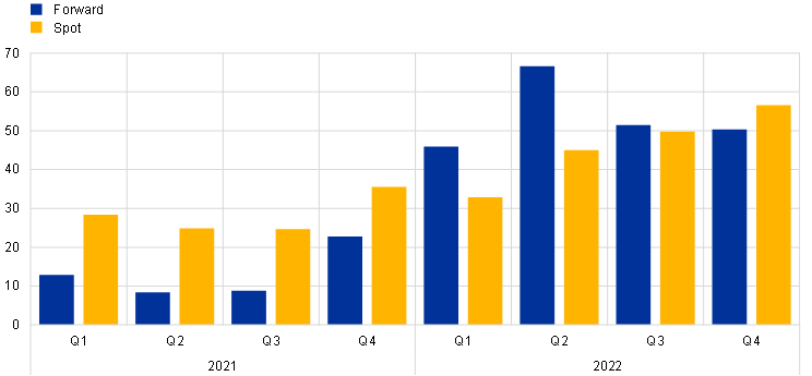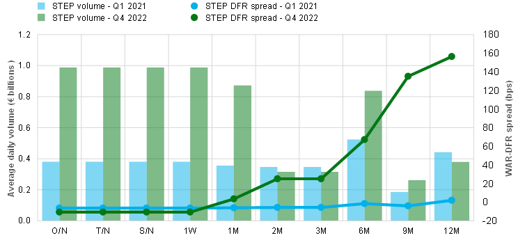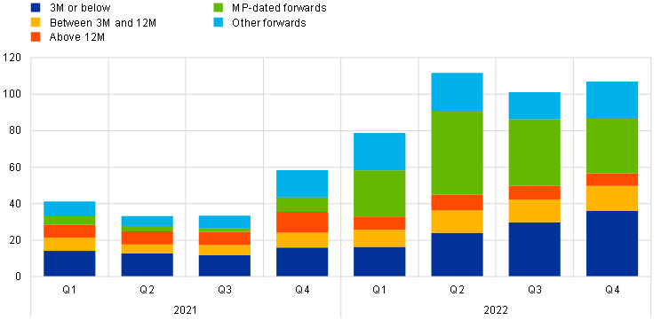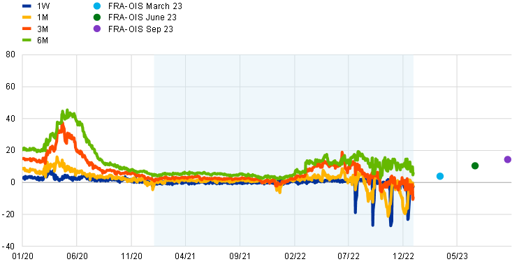 Unsecured borrowing rates remained anchored to the DFR, only marginally drifting away when investors preferred short-term investment in a context of very ample excess liquidity. Overnight unsecured borrowing rates remained anchored to the DFR during the whole period under review, almost perfectly mirroring the official interest rate hikes. Still, the €STR-DFR spread had widened slightly to 10 basis points by the end of 2022, compared with 6 basis points at the beginning of 2021. This can be partly explained by the further increase in excess liquidity during the same period. The widening of the €STR-DFR spread – and the negative one-month EURIBOR-OIS spread – came from an imbalance between demand and supply for cash in the money market. On the supply side, depositors holding excess liquidity favoured investments in short maturities as they offered positive returns in an environment still dominated by high uncertainty surrounding the terminal rate and the policy rate path thereafter. On the demand side, euro area banks discouraged short-term cash inflows, as they weigh on the banks’ regulatory ratios. Forward spreads (i.e. FRA-OIS spreads) remained positive, suggesting that the negative EURIBOR-OIS spreads were expected to be temporary and outweighed in future by lower levels of excess liquidity.
