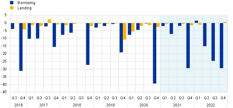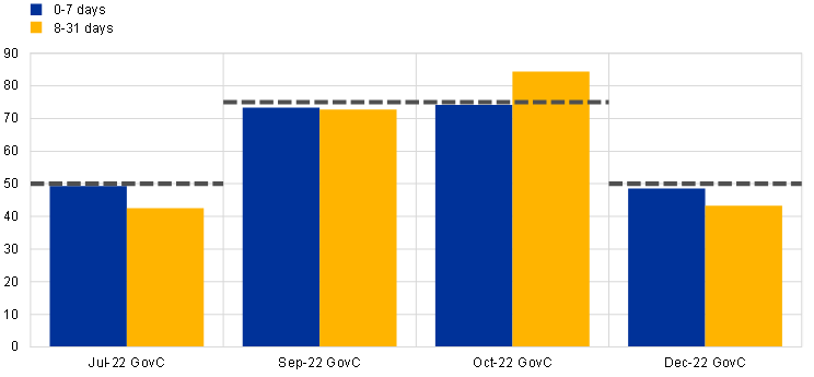 The withdrawal of ECB monetary policy accommodation was accompanied by measures aimed at supporting monetary policy transmission and the orderly functioning of markets. The measures supporting monetary transmission and market functioning included (i) the temporary suspension in September 2022 of the zero interest rate ceiling for remunerating government and foreign central bank deposits until April 2023; (ii) the increase in the aggregate limit for securities lending against cash to €150 billion in November 2021, and to €250 billion in November 2022; and (iii) the extension of the Eurosystem repo facility (EUREP) for non-euro area central banks and of temporary swap and repo lines until January 2024. Furthermore, the Governing Council decided to adjust the remuneration of minimum reserves to the deposit facility rate (DFR) as of 21 December 2022, in order to align remuneration with the marginal cost and return of liquidity in the current abundant liquidity environment.