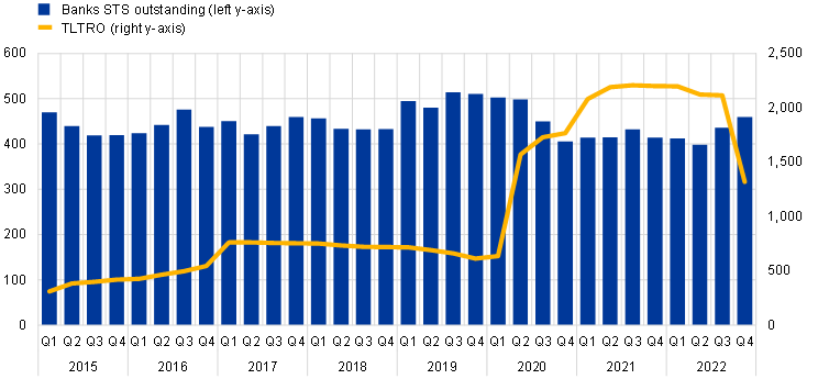 Policy measures in the second half of 2022 have eased collateral scarcity and alleviated the severe collateral shortage (Chart 1.2.3, panel b). As mentioned earlier, in October 2022, the Deutsche Finanzagentur put €54 billion of own-held German bonds on the market, helping to smooth over German repo rates. Moreover, the temporary suspension of the 0% remuneration applied by the ECB to non-monetary policy deposits, together with the increase of the aggregate limit for securities lending against cash and the early repayments from the TLTRO III programme, served to alleviate tensions in the availability of collateral.