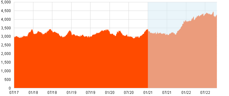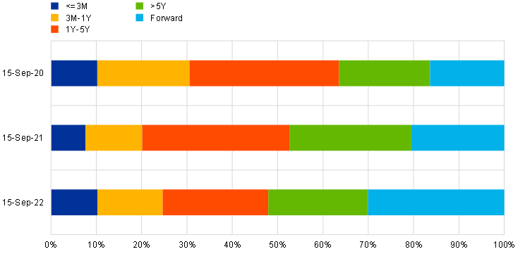 Derivative contracts can have very long maturities, sometimes as long as 50 years. This is also shown in the distribution of the OIS contracts stock (Chart 5.3.2). OIS outstanding amounts are indeed dominated by contracts above one year. While transactions with longer maturities are less frequent, they represent a larger weight of the stock of derivatives. Moreover, 30% of the stock of OIS trades is made up of trades with forward contracts. The growth of forward transactions was remarkable in 2022, as in 2020 they only represented 15%.