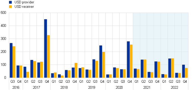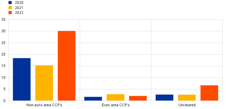 Non-euro area CCPs cleared most of the OIS trades (Chart 5.4.2). The OIS volumes cleared by non-euro area CCPs significantly increased in 2022 to €30.1 billion from €15.3 billion in 2021. EU-based CCPs, which gained relevance in 2021, saw volumes declining in 2022 to levels seen in 2020.