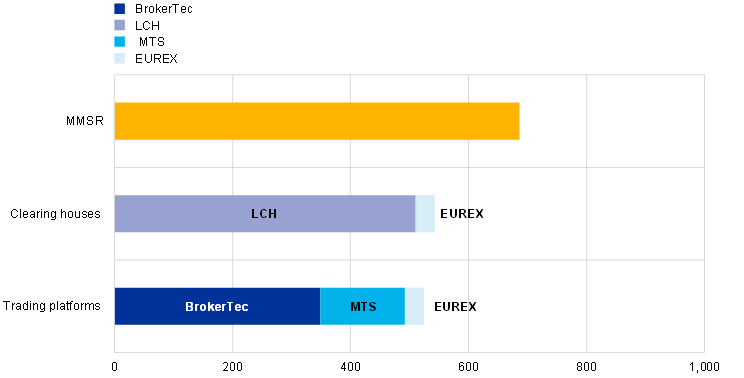 Sources: MMSR (total repo volume, lending and borrowing), LCH (nominal amounts for RepoClear Ltd and RepoClear SA), EUREX Repo, BrokerTec and MTS. The data from EuroNext Clearing are not reported in the chart because they are not publicly available.