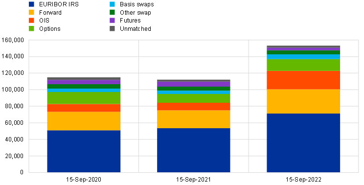 Notes: The outstanding amount is a snapshot taken on 15 September for each of the years reported, and also chosen specifically in order to avoid reporting dates. The outstanding amounts transform the daily transaction volumes (flows) into a stock variable based on maturity dates. Novations are excluded.