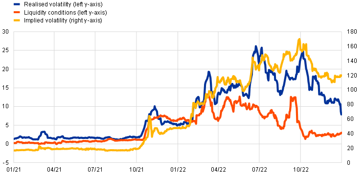 The repricing of interest rate expectations was accompanied by a surge in realised and expected volatility of OIS contracts to unprecedented levels, reflecting the market uncertainty surrounding future interest rates (Chart 5.2.3). Realised volatility, measured as the intraday trading range of OIS forward contracts, started to increase in the fourth quarter of 2021. At this time foreign central banks had initiated a review of forward guidance on the policy outlook in order to faster normalise their accommodative monetary policy stances. Expected volatility also started to increase, along with a deterioration in liquidity conditions in the OIS market, which was reflected in wider bid-offer spreads. These uncertainty measures further increased throughout 2022 and peaked around mid-2022, amid higher-than-expected inflation, economic activity data prints and unprecedented interest rate hikes by central banks.