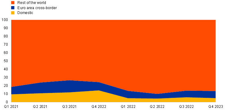 Note: Novations excluded. Domestic refers to trades with a counterparty located in the same jurisdiction than the MMSR reporting bank. Euro area cross-border refers to trades with a counterparty located in the different member state than the MMSR reporting bank. Rest of the world refers to trades with a counterparty located outside the Euro area.