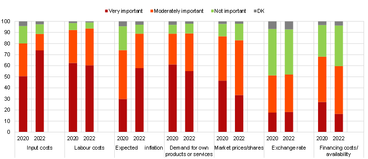 To help further understand the forces behind the expected price changes reported above, firms were also asked to report the importance of several factors when setting their prices. The factors range from demand for the firm’s own products/services, costs (for inputs, financing and labour) and market shares/competitors’ prices to expected inflation and exchange rate dynamics.