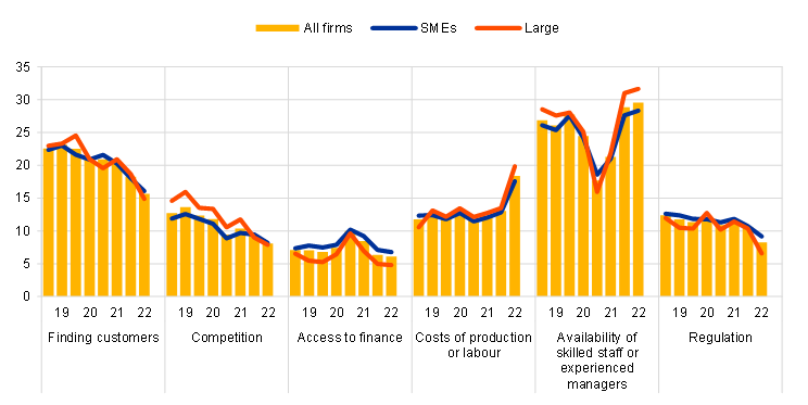 In this survey round, enterprises of all sizes, in particular large firms, reported that the lack of skilled labour and the rise in input costs were the dominant concerns for their business activity, while access to finance was among the least reported concerns (see Chart 4 in section 2). The lack of skilled labour continued to be the main concern for euro area firms (30%), followed by the increase in costs of production and labour (18%). At the same time, concerns about access to finance remained unchanged at a low level in the euro area as a whole (6%), while difficulty in finding customers declined (16%). Meanwhile, concerns about competition and regulatory burden (both 8%) were relatively limited for enterprises in the euro area.