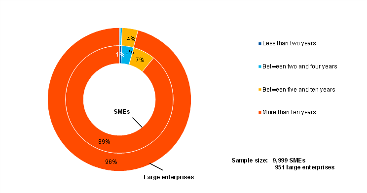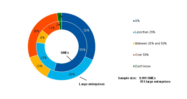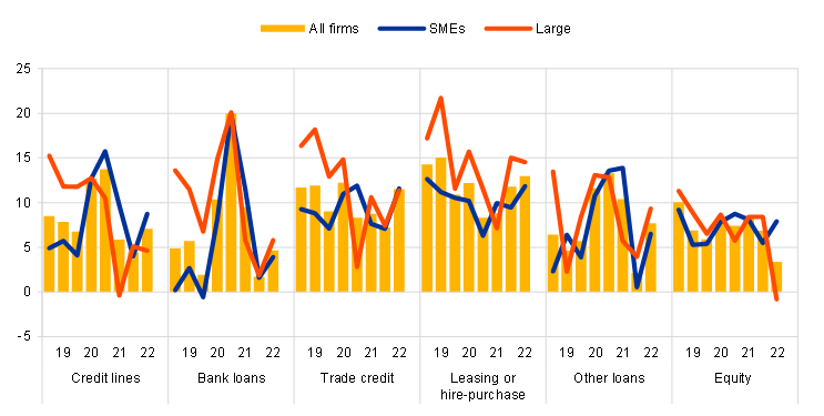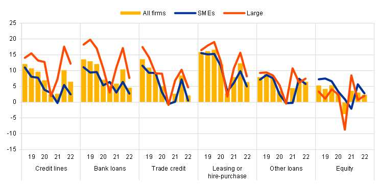 Base: All enterprises. The figures refer to rounds 11-26 of the survey (March 2014-September 2014 to October 2021-March 2022) for all firms and to rounds 19-26 (April 2018 -September 2018 to October 2021-March 2022) for SMEs and large firms.