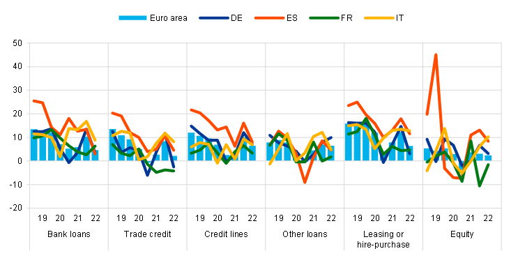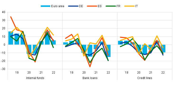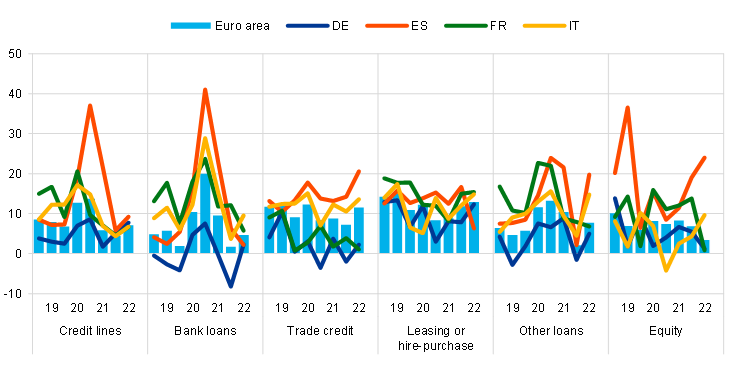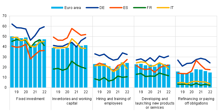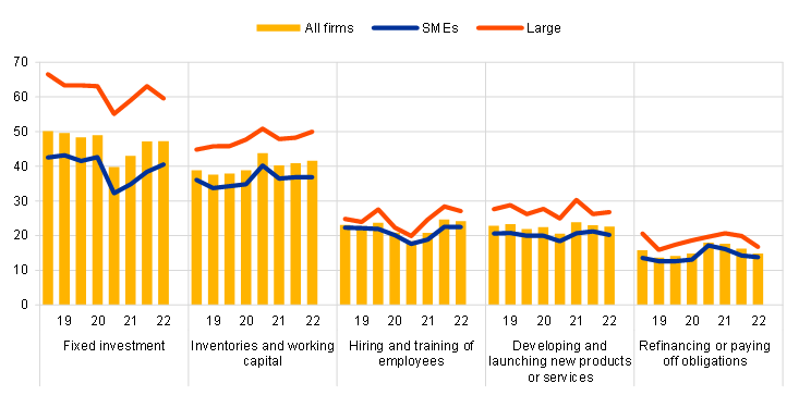 In net terms, euro area firms reported moderate increases in the demand for bank loans and credit lines at the euro area level, with credit demand broadly in line with pre-pandemic levels in most euro area countries (see Table 1, columns 2 and 4 in this section). A net 5% of companies reported higher demand for bank loans (down from 2% in the previous survey round) and 7% for credit lines (up from 4%). The results are in line with the overall growth in bank loans recorded since last October in the euro area, even though they show some heterogeneity across size classes, with SMEs more often reporting increases in their need for credit lines than large firms. External and internal financing continued to be used primarily for fixed investment, inventories and working capital.