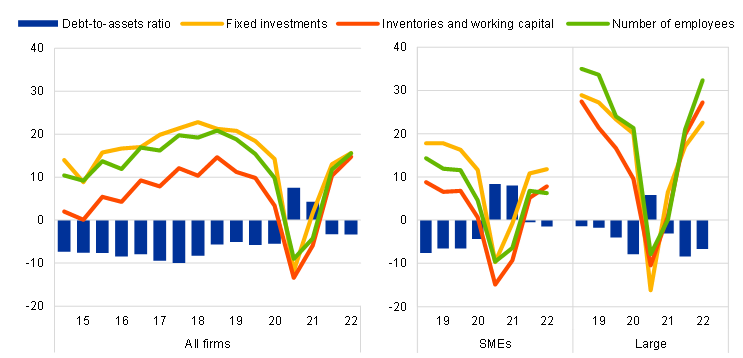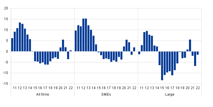 Despite the resilient business activity, higher costs have weighed on firms’ profits, but with important differences across firm sizes. While a positive net percentage of large companies continued to report an increase in profits (15%, down from 20% in the previous round), SMEs reported a deterioration in profits in net terms (-15% overall, and -1%, -14% and -23% for medium-sized, small and micro SMEs respectively).