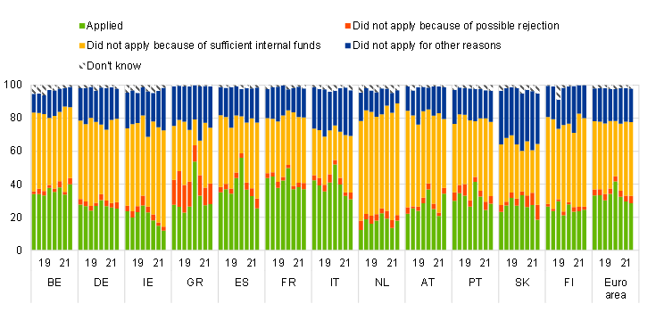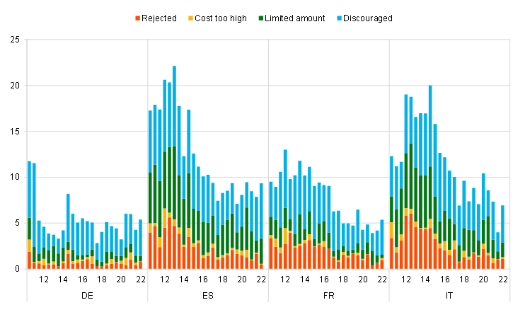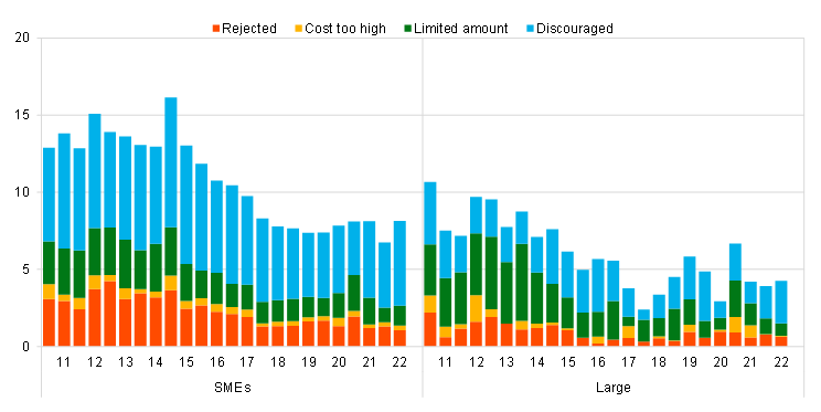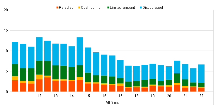 Notes: Financing obstacles are defined here as the total of the percentages of enterprises reporting (i) loan applications that were rejected, (ii) loan applications for which only a limited amount was granted, (iii) loan applications that resulted in an offer that was declined by the enterprise because the borrowing costs were too high, and (iv) a decision not to apply for a loan for fear of rejection (discouraged borrowers). The calculation of the indicator starts in 2010, when the question on applications for credit lines was first included in the questionnaire. The components of the financing obstacles indicator were affected by the amendments to the questionnaire in round 11 (filtering based on the relevance of the financing instrument and addition of the new category “my application is still pending”), and past data have been revised accordingly. These figures include the categories “my application is still pending” and “don’t know”.
