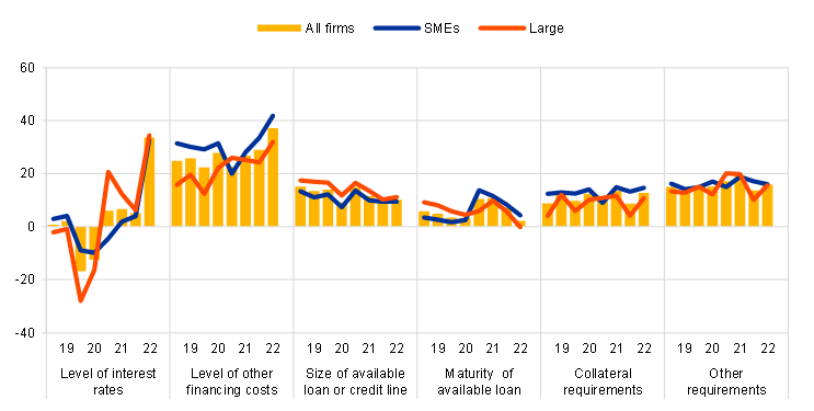 Notes: Positive values indicate a deterioration in firms’ financing conditions and a net widening of loan margins. Small and medium-sized enterprises (SMEs) have fewer than 250 employees. For details, see the note to Chart B. Latest observation: October 2021- March 2022.