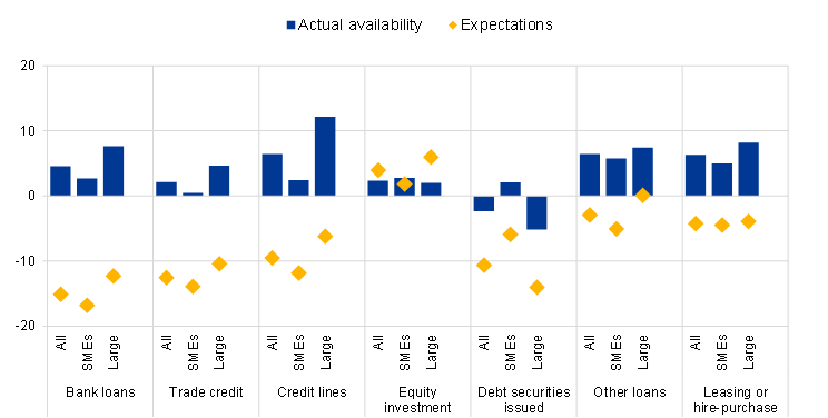 Overall, euro area firms still indicated an improvement in the availability of bank loans, albeit to a lesser extent than in the previous survey (5% compared with 10%) (see Table 1, column 6 in this section). Although the percentage of firms reporting improvements in availability was smaller than in the previous round across size classes, large companies continued to indicate a much higher improvement in the availability of banking products than SMEs.