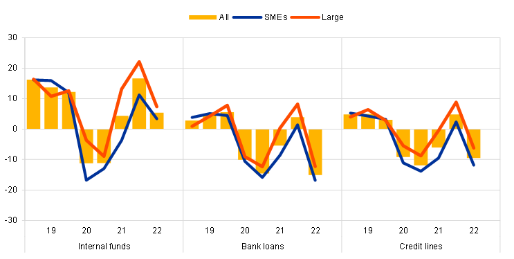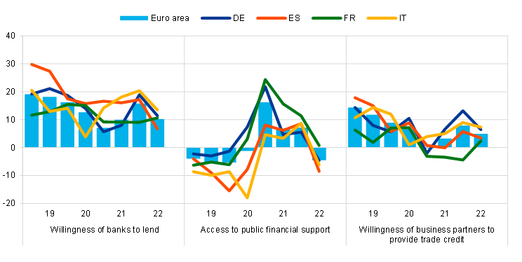 Reflecting the completion of many public support programmes in the euro area, firms started to report that public financial support was playing a decreasing role in easing access to finance. The role of public financial support returned to a level in line with the survey rounds before the pandemic. In this respect SMEs were more pessimistic than large firms (-6% and -2%, respectively).