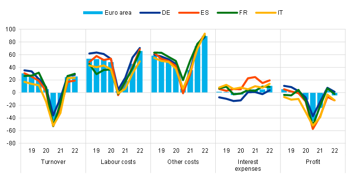 At the same time, euro area enterprises also reported significant increases in materials and energy costs, as well as labour costs. A very high proportion of euro area firms reported rises in materials and energy costs (89%, up from 73%) and in labour costs (66%, up from 45%), with increases being reported for all firm sizes. Similarly, euro area firms reported an increase in interest rate expenses, with higher net percentages across all firm sizes.