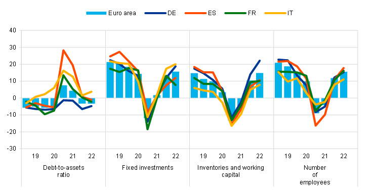 The recovery in fixed investment expenses, in inventories and working capital and in employment remained widespread across countries. In net terms, the percentages of firms reporting increases in fixed investment ranged between 8% and 20%, while for inventories and working capital expenses they ranged between 8% and 22%, and for employment between 11% and 18% in the four largest euro area economies.