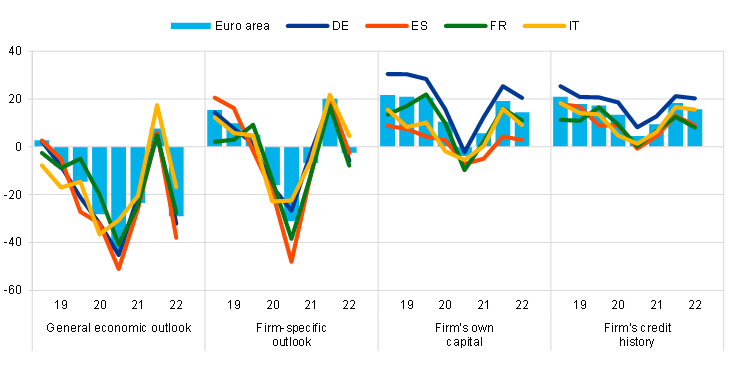 Developments in firms’ debt-to-assets ratios show diverging patterns across euro area countries. Looking at the four largest economies, German firms continued to report lower debt-to-assets ratios in net terms in this survey round in line with the aggregate at euro area level, while in the other large countries, enterprises continued to report increases, particularly in Italy (4%, up from 2%) (see Chart 20 in Annex 1 for other countries).
