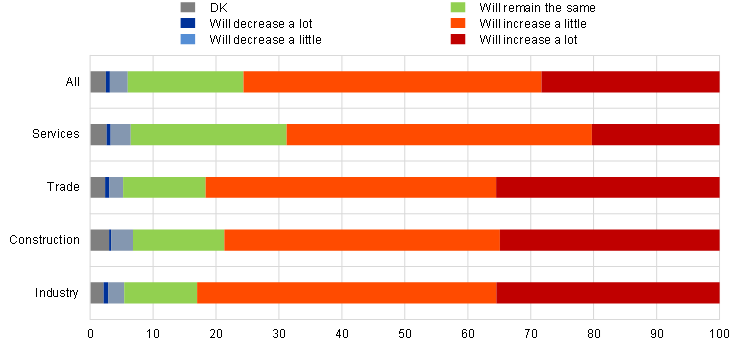 Higher selling prices are predominantly expected by firms in industry, construction, and trade sectors, while more moderate increases prevail in services (see Chart D in this section). Around 35% of firms in the former three sectors expect their prices to increase “a lot”. By contrast, the respective percentage for service firms is only 20%. Moreover, while 25% of service firms report no expectations of raising their prices in the near future, that percentage is significantly lower in the other sectors (12%, 15% and 13% for industry, construction and trade, respectively). Although there is no exact mapping between firms’ sector prices and HICP main sub-components, these survey results would be consistent with stronger price pressures in the non-energy industrial goods component of the HICP, with more limited price pressures in the services price sub-component.