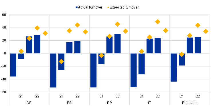 Across countries, trends in firms’ business activity have followed very similar patterns over the past six months (see Chart 19 in Annex 1). Firms in the largest euro area countries showed a very similar recovery in turnover. However, while the widespread increases in labour and other costs led to a net percentage of companies continuing to report a decline in profits for the euro area aggregate, Spanish and Italian enterprises were particularly affected (-12% for both compared with -4% for the euro area as a whole).